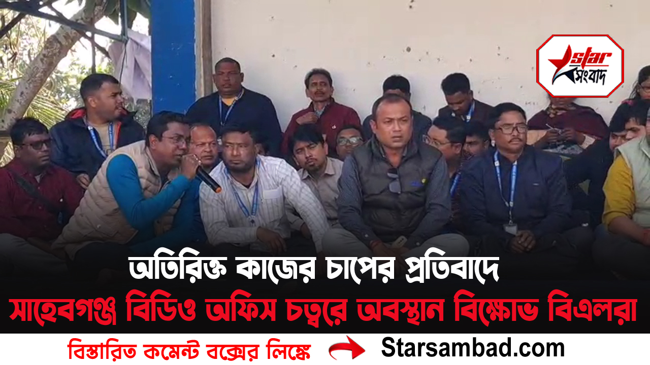 অতিরিক্ত কাজের চাপের প্রতিবাদে সাহেবগঞ্জ বিডিও অফিস চত্বরে অবস্থান বিক্ষোভ পালন করছেন দিনহাটা দুই নম্বর ব্লকের বিএলও রক্ষা কমিটির সদস্যরা