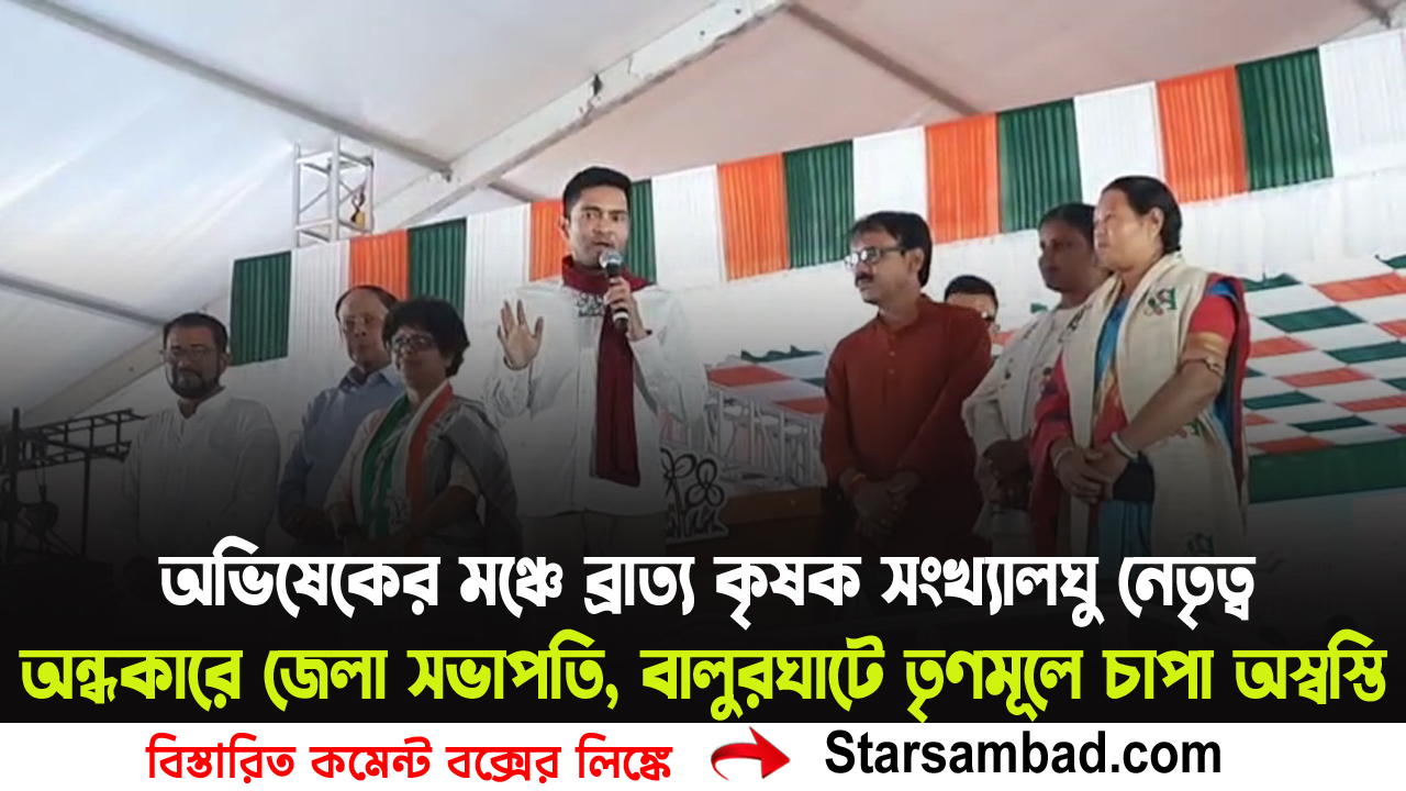 বালুরঘাট, ৩১ মার্চ —– বালুরঘাটে অভিষেক বন্দ্যোপাধ্যায়ের জনসভা ঘিরে এবার প্রকাশ্যে না এলেও দলের অন্দরে তৈরি হল অস্বস্তির সুর। মঙ্গলবার টাউনক্লাব মাঠে তৃণমূলের দুই প্রার্থী অর্পিতা ঘোষ ও চিন্তামনি বিহার সমর্থনে আয়োজিত সভায় উপস্থিত ছিলেন দলের জেলা সভাপতি থেকে শুরু করে ছাত্র, যুব, মহিলা ও শ্রমিক সংগঠনের শীর্ষ নেতৃত্ব। তবে চোখে পড়ার মতোভাবেই অনুপস্থিত ছিলেন কৃষক ও সংখ্যালঘু সংগঠনের দুই জেলা সভাপতি—আর তাতেই শুরু হয়েছে জল্পনা।