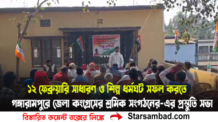 শীতল চক্রবর্তী বালুরঘাট ৮ ফেব্রুয়ারি দক্ষিণ দিনাজপুর:সমস্ত কেন্দ্রীয় ট্রেড ইউনিয়নের ডাকে শ্রম কোড বাতিলসহ একাধিক দাবিকে সামনে রেখে আগামী ১২ ফেব্রুয়ারি দেশব্যাপী সাধারণ ধর্মঘট এবং পশ্চিমবঙ্গে শিল্প ধর্মঘট সফল করার লক্ষ্যে রবিবার গঙ্গারামপুর শহরের মাড়োয়ারি ভবনে এক প্রস্তুতি সভার আয়োজন করল ভারতের জাতীয় কংগ্রেসের শ্রমিক সংগঠন জেলা কংগ্রেসের শ্রমিক সংগঠনের-এর দক্ষিণ দিনাজপুর জেলা নেতৃত্ব।