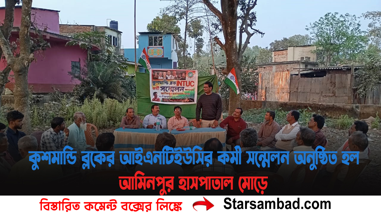 আজ আমিনপুরের হাসপাতাল মোড়ে কুশমান্ডি ব্লক INTUC র কর্মী সন্মেলন অনুষ্ঠিত হল। শ্রমকোড বাতিল, শ্রমিকদের নূন্যতম ৪০০টাকা মজুরি, ১০০দিনের কাজ পুনরায় চালু করা, রাষ্ট্রায়ত্ত সংস্থাকে বেসরকারিকরন বন্ধ করা, ২০২৬ সালে বিধানসভা নির্বাচন সহ অন্যান্য বিষয় নিয়ে কর্মী সন্মেলন অনুষ্ঠিত হল। সভায় উপস্থিত ছিলেন জেলা INTUC সভাপতি রতন কুমার সরকার, জেলা সাধারণ সম্পাদক শেখর কুমার দেব, নন্দন দাস, ব্লক সভাপতি আনসার আলী, ব্লক কংগ্রেস সভাপতি আইনুল বারি, ওডিসি জেলা সভাপতি আশরাফুল ইসলাম সহ অন্যান্য নেতৃত্ব।