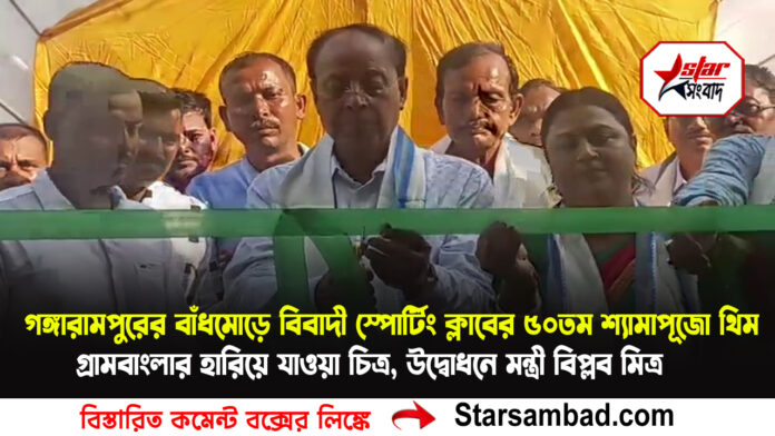 শীতল চক্রবর্তী, বালুরঘাট, ১৯ অক্টোবর:-দক্ষিণ দিনাজপুর:দক্ষিণ দিনাজপুর জেলার গঙ্গারামপুর শহরের ১৪ নম্বর ওয়ার্ডের বাঁধমোড়ে অবস্থিত বিবাদী স্পোর্টিং ক্লাব এবছর পদার্পণ করল ৫০ বছরে। সুবর্ণজয়ন্তী বর্ষে ক্লাবের শ্যামাপূজোর থিম রাখা হয়েছে “গ্রামবাংলার হারিয়ে যাওয়া চিত্র”।রাজ্যের ক্রেতা সুরক্ষা দপ্তরের মন্ত্রী বিপ্লব মিত্র রবিবার দুপুরে পুজোর উদ্বোধন করেন।