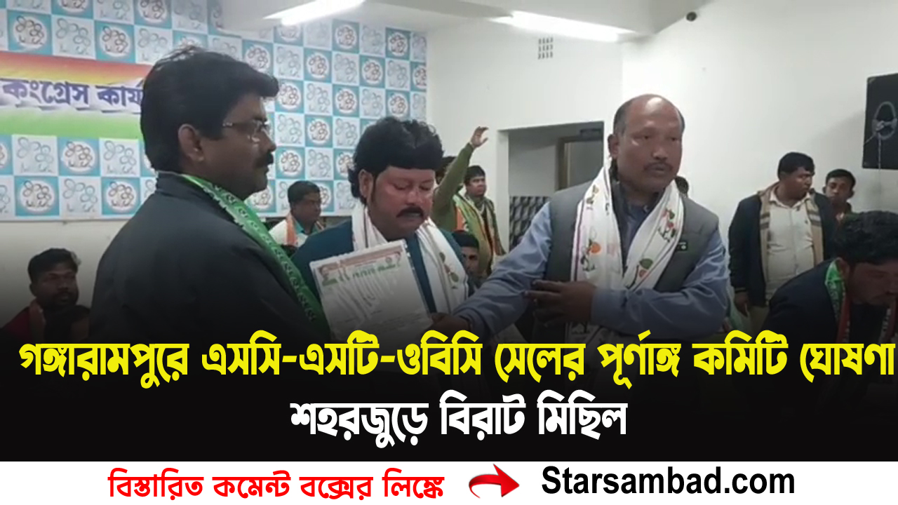 শীতল চক্রবর্তী বালুরঘাট, ৩ ফেব্রুয়ারি দক্ষিণ দিনাজপুর।একটি অনুষ্ঠানের মধ্য দিয়ে দক্ষিণ দিনাজপুর জেলার এসসি, এসটি ও ওবিসি সেলের দক্ষিণ দিনাজপুর জেলার গঙ্গারামপুর টাউন তৃণমূল কংগ্রেসের পূর্ণাঙ্গ কমিটি ঘোষণা করা হলো। এই উপলক্ষে গঙ্গারামপুর শহরজুড়ে সংগঠনের পক্ষ থেকে একটি বিরাট আকারের মিছিলের আয়োজন করা হয়।