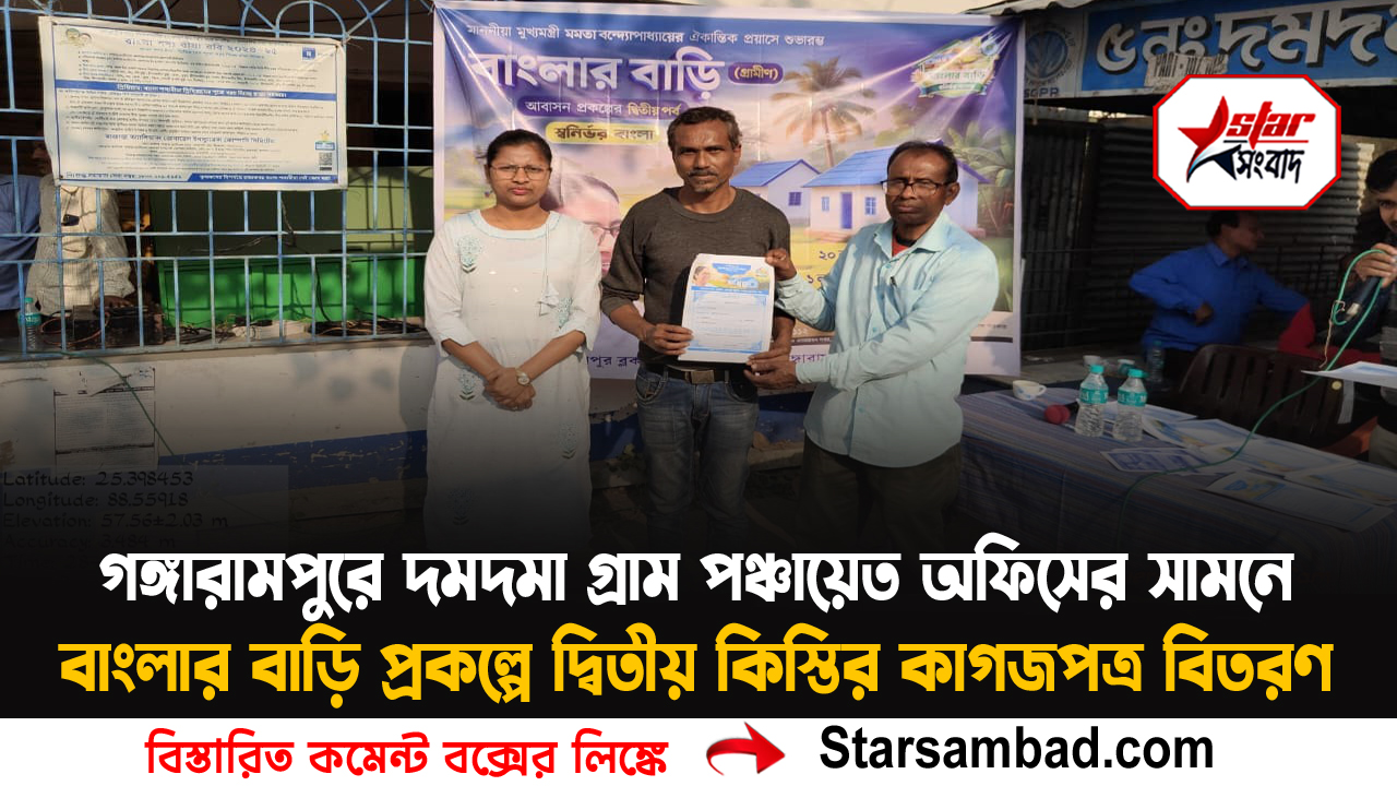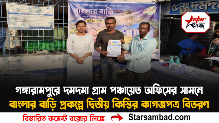 শীতল চক্রবর্তী বালুরঘাট ২৮ জানুয়ারি দক্ষিণ দিনাজপুর।দক্ষিণ দিনাজপুর জেলার গঙ্গারামপুর ব্লকের ৫ নম্বর দমদমা গ্রাম পঞ্চায়েত অফিসের সামনে বুধবার একটি অনুষ্ঠানের মধ্য দিয়ে বাংলার বাড়ি (গ্রামীণ) আবাসন প্রকল্পের দ্বিতীয় কিস্তির টাকা দেবার জন্য কাগজপত্র তুলে দেওয়া হলো ৭৭ জন উপভোক্তার হাতে। প্রতিজন উপভোক্তা ৬০ হাজার টাকা করে দ্বিতীয় কিস্তির অর্থ পাবেন এই প্রকল্পের মাধ্যমে।