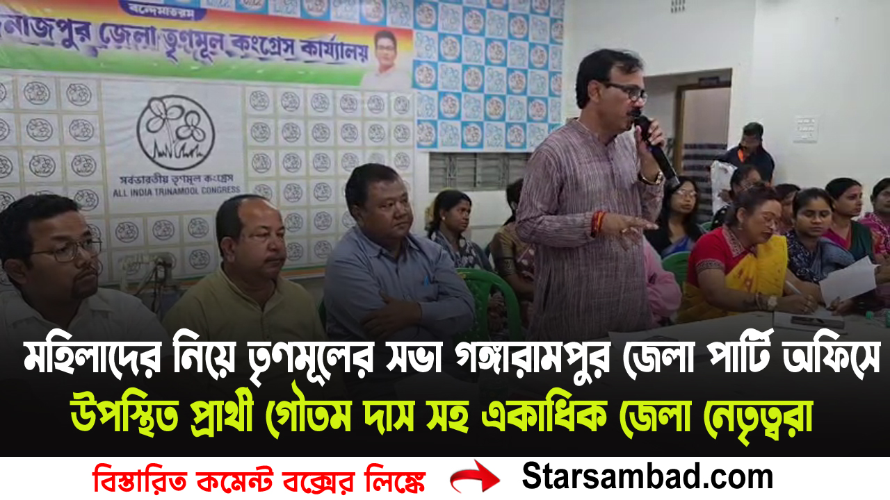 গঙ্গারামপুরে মহিলাদের নিয়ে তৃণমূলের গুরুত্বপূর্ণ সভা গঙ্গারামপুর নিউ মার্কেটের তৃণমূল জেলা পার্টি অফিসে ,উপস্থিত প্রার্থী গৌতম দাস সহ একাধিক জেলা নেতৃত্বরা
