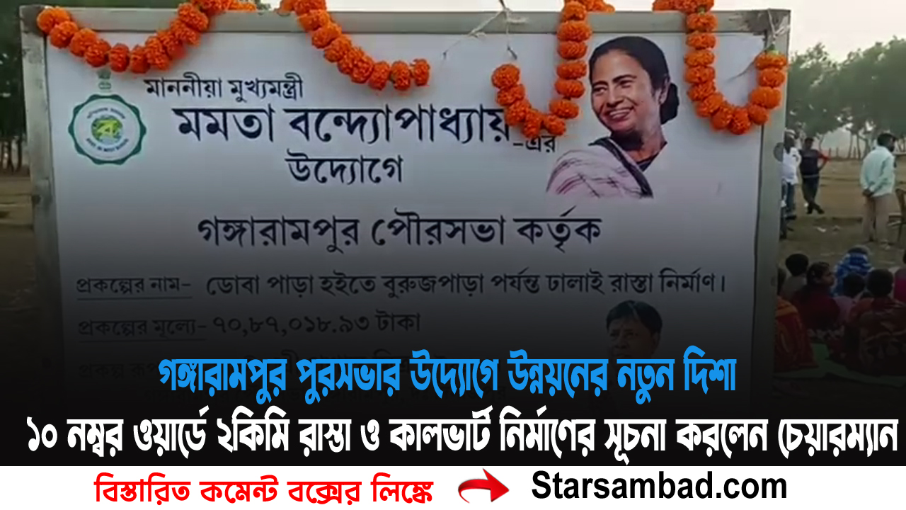 শীতল চক্রবর্তী গঙ্গারামপুর ২৪ ফেব্রুয়ারি দক্ষিণ দিনাজপুর:-দক্ষিণ দিনাজপুর জেলার গঙ্গারামপুর শহরে উন্নয়নের গতি আরও একধাপ এগোল।গঙ্গারামপুর পুরসভার ১০নম্বর ওয়ার্ডের বাসিন্দাদের দীর্ঘদিনের দাবি পূরণে ডোবাপাড়া থেকে বুরুজপাড়া পর্যন্ত প্রায় দুই কিলোমিটার ঢালাই রাস্তা ও একটি কালভার্ট নির্মাণের কাজের শুভ সূচনা হল।এদিন আনুষ্ঠানিকভাবে কাজের উদ্বোধন করেন গঙ্গারামপুর পুরসভার চেয়ারম্যান প্রশান্ত মিত্র।