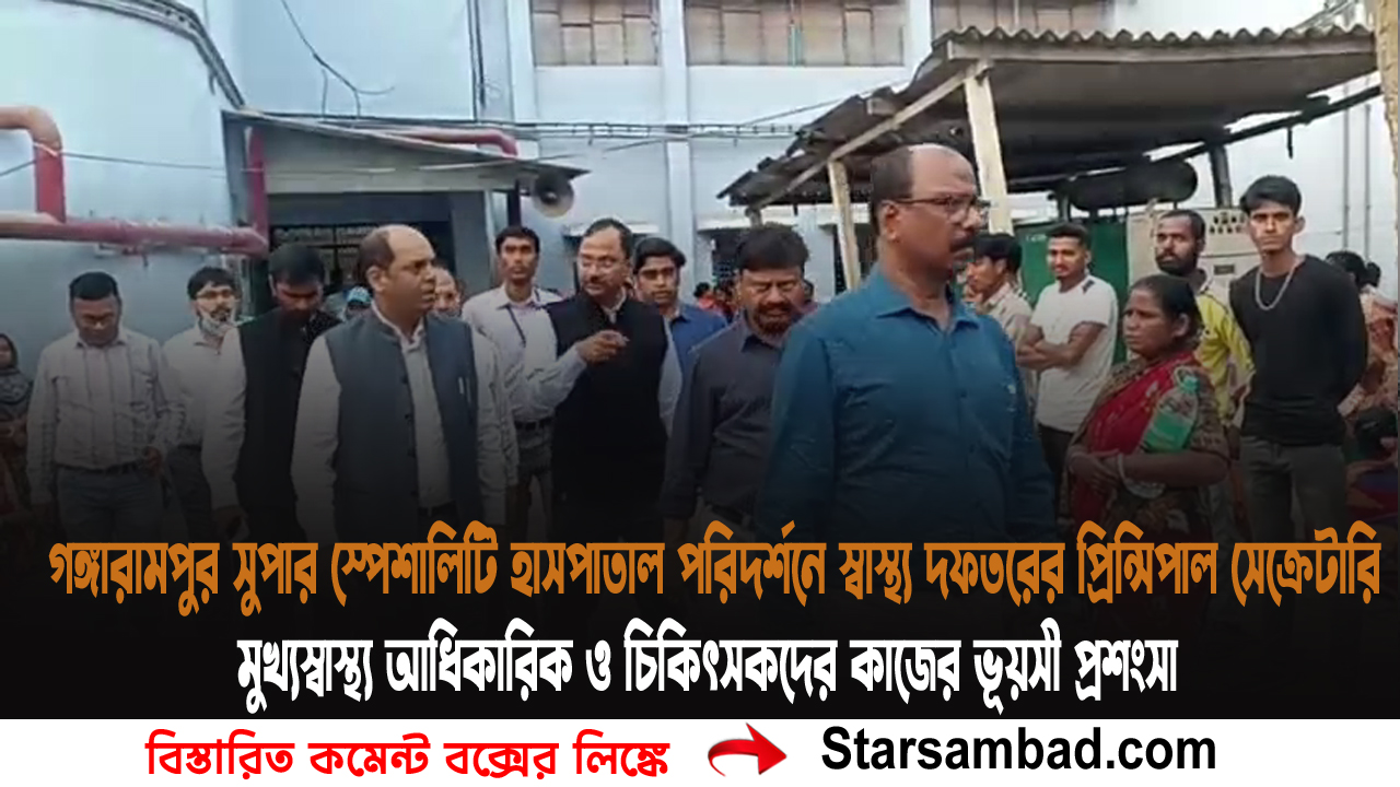 শীতল চক্রবর্তী বালুরঘাট ২১ ফেব্রুয়ারি দক্ষিণ দিনাজপুর।দক্ষিণ দিনাজপুর জেলার গঙ্গারামপুর সুপার স্পেশালিটি হাসপাতাল পরিদর্শনে এলেন পশ্চিমবঙ্গ সরকার স্বাস্থ্য ও পরিবার কল্যাণ দপ্তর-এর প্রিন্সিপাল সেক্রেটারি নারায়ণ স্বরূপ নিগম। শনিবার বিকেলে কালদিঘি এলাকায় অবস্থিত এই হাসপাতালের বিভিন্ন ওয়ার্ড ঘুরে দেখেন তিনি।