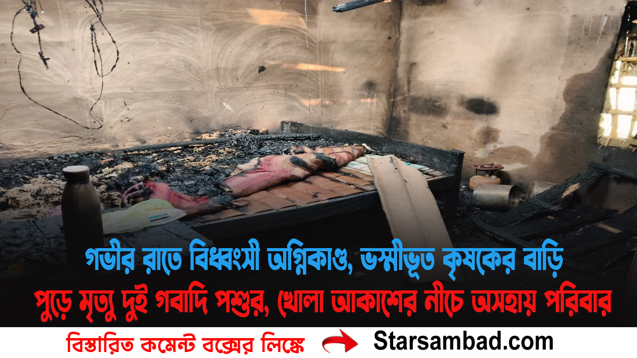 গভীর রাতে বিধ্বংসী অগ্নিকাণ্ড, ভস্মীভূত কৃষকের বাড়ি—পুড়ে মৃত্যু দুই গবাদি পশুর, খোলা আকাশের নীচে অসহায় পরিবার