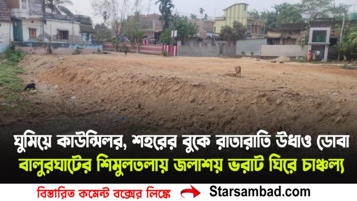 বালুরঘাট, ১১ মার্চ —- শহরের মাঝেই দিনের আলোয় চলছে ডোবা ভরাট, অথচ নীরব জনপ্রতিনিধি ও প্রশাসন—এই অভিযোগে উত্তাল বালুরঘাটের ১৪ নম্বর ওয়ার্ডের শিমুলতলা এলাকা। বাসিন্দাদের দাবি, তাঁদের বাধা উপেক্ষা করেই বেপরোয়া ভাবে বহু পুরনো একটি ডোবা মাটি ফেলে ভরাট করা হচ্ছে। যে ঘটনাকে ঘিরে এলাকায় তীব্র ক্ষোভ তৈরি হয়েছে।