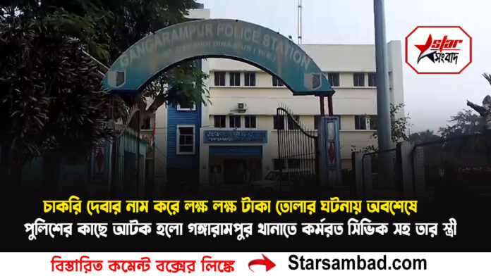 গঙ্গারামপুর থানাতে কর্মরত এক সিভিক ভলেন্টিয়ার,সেই সুযোগকে কাজে লাগিয়ে তিনি ও তার স্ত্রী বিভিন্ন জনের কাছে বিভিন্ন জায়গায় চাকরি দেবার নাম করে লক্ষ লক্ষ টাকা তোলার ঘটনায় অবশেষে পুলিশের কাছে আটক হলো ওই সিভিক সহ তার স্ত্রী।