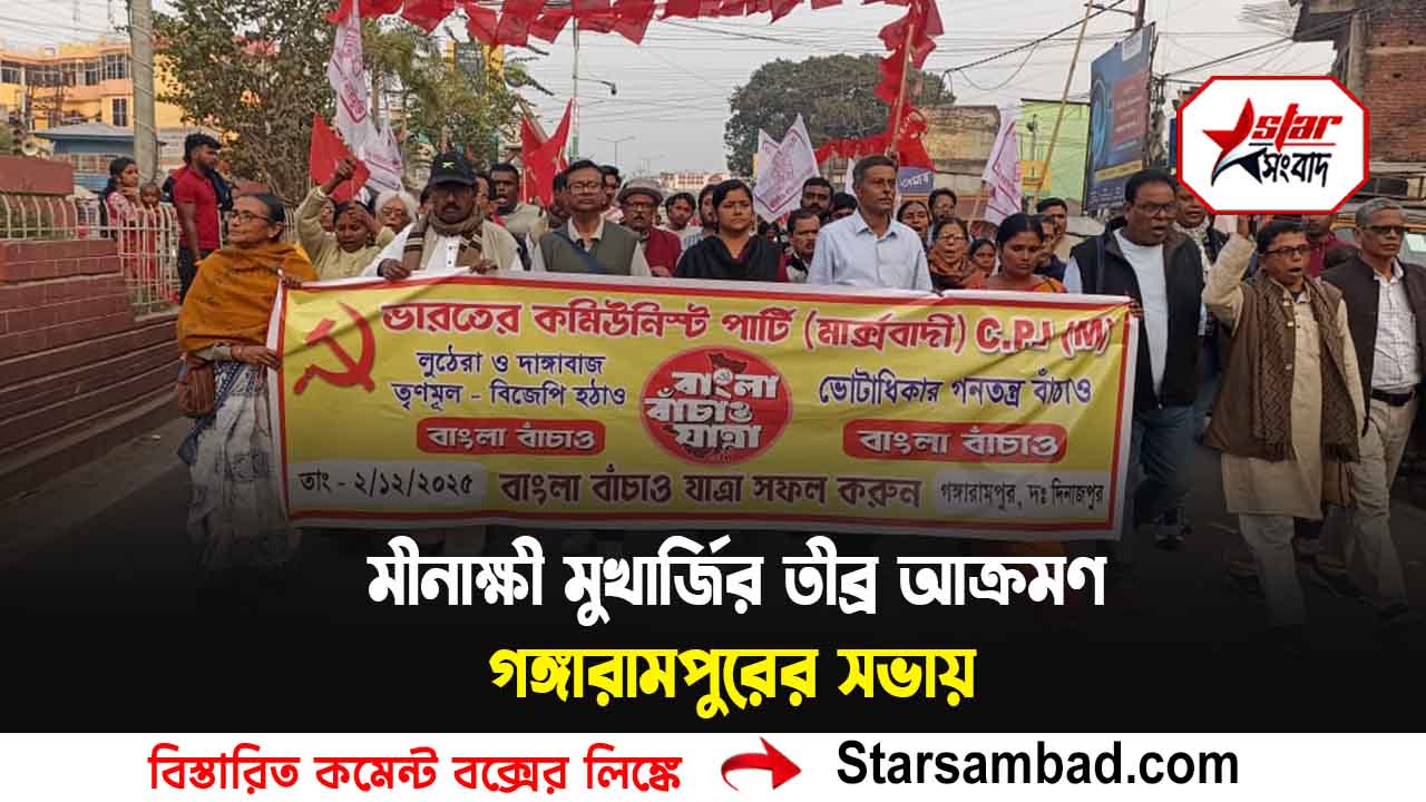 দুর্নীতিগ্রস্ত তৃণমূল নেতাদের ‘টাইট’ দিতে কর্মীদের নিধান দিলেন মীনাক্ষী মুখার্জির তীব্র আক্রমণ গঙ্গারামপুরের সভায় শীতল চক্রবর্তী ২ ডিসেম্বর : যে সমস্ত নোংরা চরিত্রের মানুষ, লুটেরা, গুন্ডা-মাফিয়া,লোকের খেয়ে নিজের ভুড়ি বাড়াচ্ছেন, তাদের চিহ্নিত করে টাইট দিতে হবে।” গঙ্গারামপুর চৌপথিতে আয়োজিত ‘বাংলা বাঁচাও যাত্রা’-র সভায় তৃণমূল কংগ্রেসকে উদ্দেশ্য করে এমন কড়া মন্তব্য করলেন সিপিআইএমের রাজ্য নেত্রী মীনাক্ষী মুখার্জি। তাঁর দাবি, “এই চোরেদের একজনকেও টাইট দিতে পারলে, বাপ-বেয়াড়ে সবাই টাইট হয়ে যাবে।”রাজ্য সরকারের বিরুদ্ধে চাকরি নিয়ে মিথ্যাচারের অভিযোগও তোলেন তিনি। বলেন,“রাজ্যের ৮০ হাজার ৪৮২ বুথে ২ কোটিরও বেশি চাকরি দেওয়ার দাবি করা হচ্ছে। তা হলে প্রতিটি বুথে অন্তত ২৪৮ জন চাকরি পাওয়ার কথা। কিন্তু বাস্তবে আমরা তা দেখতে পাচ্ছি না।”