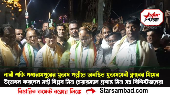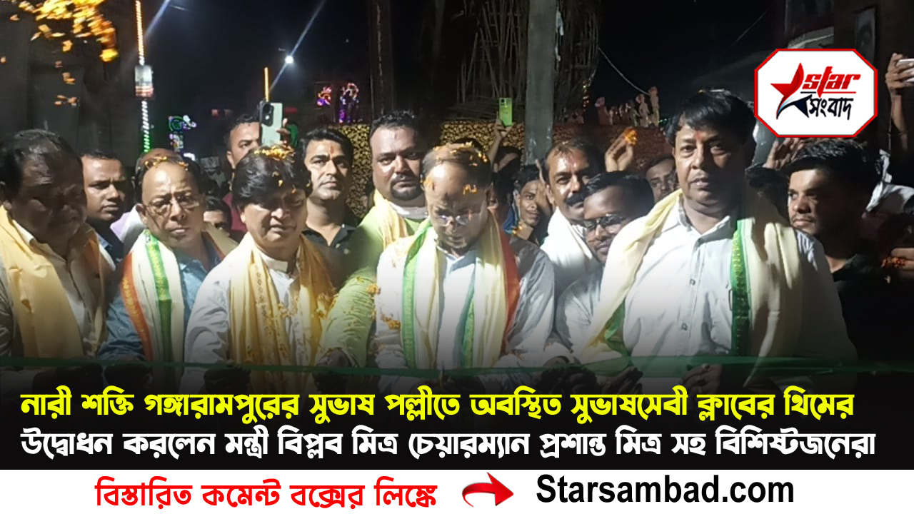 নারী শক্তি গঙ্গারামপুরের সুভাষ পল্লীতে অবস্থিত সুভাষসেবী ক্লাবের থিমের উদ্বোধন করলেন মন্ত্রী বিপ্লব মিত্র চেয়ারম্যান প্রশান্ত মিত্র সহ বিশিষ্টজনেরা