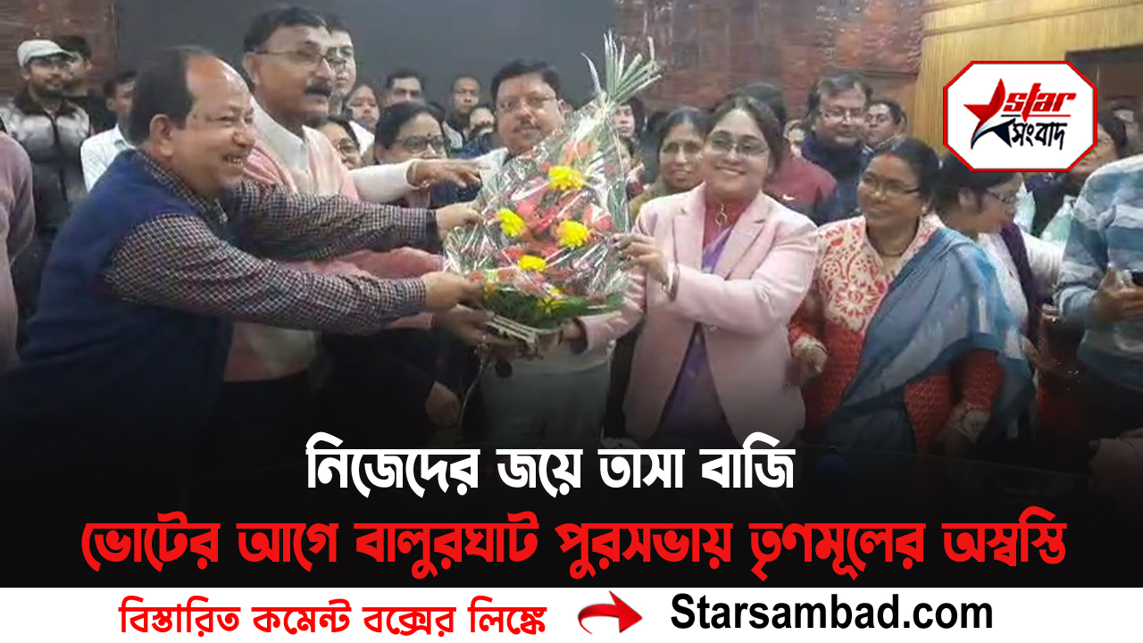 বালুরঘাট, ১৭ জানুয়ারী —– বিধানসভা নির্বাচনের আগে বালুরঘাট শহরের রাজনীতিতে ফের অস্বস্তির ছবি। পুরসভার চেয়ারম্যান বদলকে ঘিরে তৃণমূলের গোষ্ঠীদ্বন্দ্ব শনিবার প্রকাশ্যে চলে এল তাসা–বাজি আর উল্লাসের আড়ম্বরের মধ্য দিয়ে। প্রাক্তন চেয়ারম্যান অশোক মিত্রকে সরিয়ে চেয়ারম্যানের দায়িত্ব নিলেন সুরজিত সাহা ওরফে বাবু। ভাইস চেয়ারম্যান করা হল স্কুল শিক্ষিকা মুনমুন করকে। কিন্তু প্রশাসনিক রদবদলের সেই মুহূর্তেই পুরসভা চত্বরে যে উদযাপনের দৃশ্য ধরা পড়ল, তা নিয়ে প্রশ্ন তুলেছেন শহরের বহু বাসিন্দা।