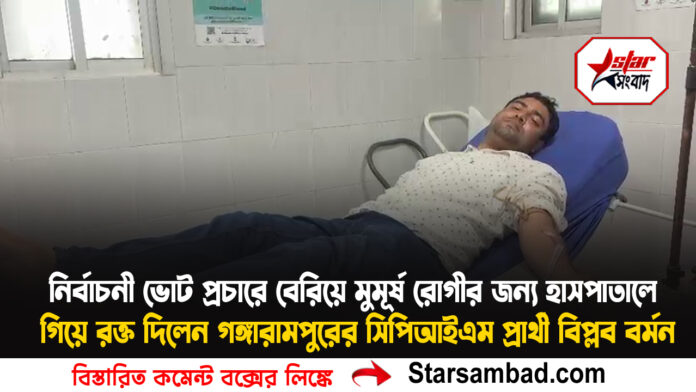নির্বাচনী ভোট প্রচারে বেরিয়ে মুমূর্ষ রোগীর জন্য হাসপাতালে গিয়ে রক্ত দিলেন গঙ্গারামপুরের সিপিআইএম প্রার্থী বিপ্লব বর্মন,তাকে সাধুবাদ জানালেন সকলেই