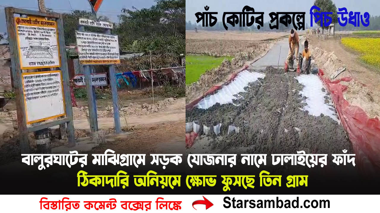 বালুরঘাট, ২৮ জানুয়ারী —- প্রধানমন্ত্রী গ্রাম সড়ক যোজনার মতো কেন্দ্রের স্বপ্নের প্রকল্পে সরকারি নিয়মকানুনকে কার্যত পদদলিত করে বালুরঘাটে চলছে বিতর্কিত রাস্তা নির্মাণ। দক্ষিণ দিনাজপুর জেলার বালুরঘাট ব্লকের মাঝিগ্রাম এলাকায় পিচের রাস্তার বদলে নিম্নমানের ঢালাই রাস্তা তৈরির অভিযোগ ঘিরে তুমুল হইচই। কয়েকশো গ্রামবাসী একযোগে কাজ বন্ধের ডাক দিয়েছেন। উত্তর মাঝিগ্রাম, দক্ষিণ মাঝিগ্রাম ও সাতরাই—এই তিন গ্রামের মানুষ উন্নয়নের নামে এই অনিয়মের বিরুদ্ধে রাস্তায় নামার প্রস্তুতি নিচ্ছেন।