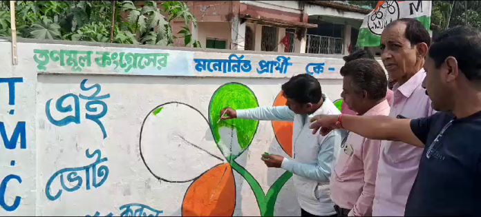 আলিপুরদুয়ারঃ ফালাকাটা টাউন ব্লক তৃণমূল কংগ্রেসের পক্ষ থেকে নির্বাচনী প্রচারের দেওয়া লিখন শুরু হল সোমবার থেকে, জানা গেছে এখনো তৃণমূলের প্রার্থী ঘোষণা হয়নি তার আগেই প্রচারে নেমে পড়েছে তৃণমূল, সোমবার তৃণমূলের ফালাকাটার দলীয় কার্যালয় থেকে সাউন্ডব্লক কমিটির সকল শাখা সংগঠন এবং তৃণমূল কংগ্রেস তারা সঙ্ঘবদ্ধভাবে এসে ফালাকাটার ৮ নম্বর ওয়ার্ডের মুক্তিপাড়ার কালী মন্দিরের পাশের দেয়াল দেওয়াল লিখন শুরু করলো, তৃণমূলের যে সকল জনকল্যাণমুখী প্রকল্প গুলো রয়েছে সেগুলো তুলে ধরা হয়েছে এই দেওয়াল লিখনের মধ্য দিয়ে, এবং তাদের যে জোড়া ফুল সেই চিহ্ন লেখে এবং তৃণমূল পাড় থেকে ভোট দেওয়ার আবেদন জানিয়ে এই দেওয়াল লিখন বলে জানায় ফালাকাটা টাউন ব্লক তৃণমূল কংগ্রেসের সভাপতি শুভব্রত দে l