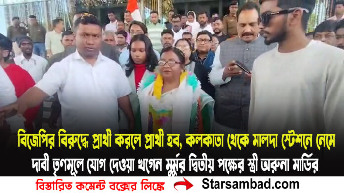 তৃণমূলে যোগদানের পর মালদায় ফিরে মালদা উত্তরের বিজেপি সাংসদ খগেন মুর্মুর দ্বিতীয় পক্ষের শ্রী অরুনা মার্ডি বলেন,মমতা দিদি ও অভিষেক ব্যার্জীর কাজে অনুপ্রানীত হয়ে তৃণমুল দলে এসেছি।শাসকদল যদি প্রার্থী করে তাহলে নির্বাচনে প্রতিদ্বন্দ্বিতা করবেন বলেন তিনি। মুখ্যমন্ত্রীর আদর্শে অনুপ্রাণিত হয়ে তিনি এসেছেন।স্বামীর দলের বিরুদ্ধে লড়বেন।তবে পারিবারিক সম্পর্ক যেমন আছে তেমন থাকবে।