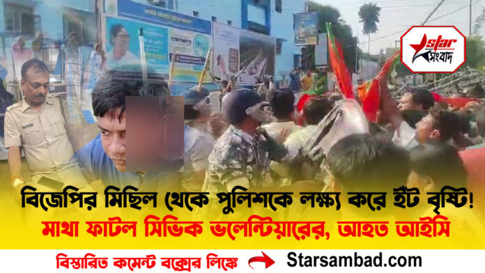 বিজেপির মিছিল থেকে পুলিশকে লক্ষ্য করে ইঁট বৃষ্টি! মাথা ফাটল সিভিক ভলেন্টিয়ারের, আহত আইসি। বালুরঘাটে বিজেপি-পুলিশ খন্ডযুদ্ধে ধুন্ধুমার কান্ড