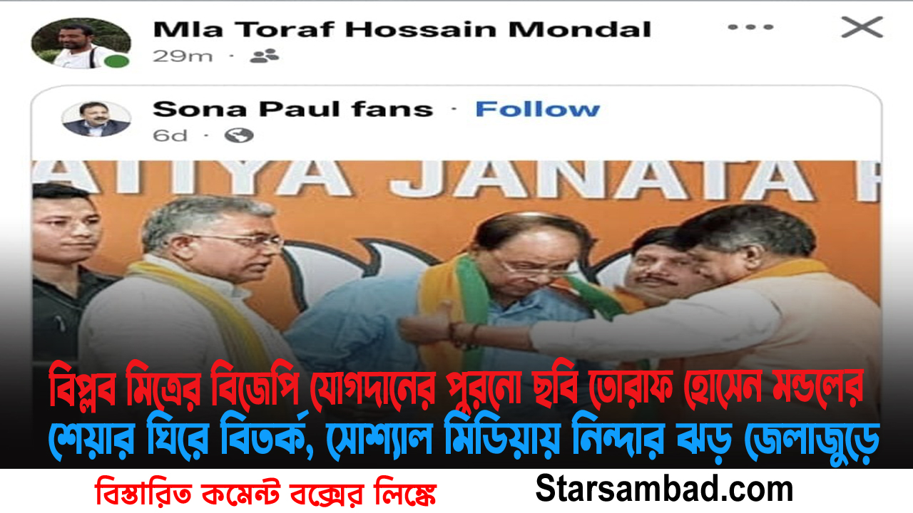 মঙ্গলবার দুপুরে হরিরামপুরের বাসিন্দা ও বিতর্কিত কংগ্রেসে যোগদানকারী নেতা শুভাশিস পাল ওরফে সোনা পাল ফেসবুকে বিপ্লব মিত্রের বিজেপিতে যোগদানের একটি বহু পুরনো ছবি পোস্ট করেন। অভিযোগ, সোনা পালের ফেসবুক পেজের সেই পোস্টটি ঠিক ৩৬ মিনিটের মধ্যেই কুমারগঞ্জের তৃণমূল বিধায়ক তথা দক্ষিণ দিনাজপুর জেলা তৃণমূল কংগ্রেসের চেয়ারম্যান তোরাব হোসেন মণ্ডল তাঁর ফেসবুক পেজে শেয়ার করেন।এই ঘটনাকে কেন্দ্র করেই সোশ্যাল মিডিয়ায় নিন্দার ঝড় ওঠে বিপ্লব মিত্রের শিবিরে।জেলা তৃণমূলের অভিভাবক তথা রাজ্যের মন্ত্রী বিপ্লব মিত্রের অনুগামীরা বিষয়টি নজরে আসতেই তীব্র প্রতিক্রিয়া জানান।বিপ্লব অনুগামীদের অভিযোগ,উদ্দেশ্যপ্রণোদিতভাবে পুরনো ছবি ব্যবহার করে জেলা তৃণমূলের অভিভাবক বিপ্লব মিত্রের রাজনীতির ভবিষ্যৎ নিয়ে বিভ্রান্তি তৈরি চেষ্টা করা হচ্ছে বিধানসভা নির্বাচনের আগে।