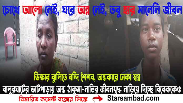বালুরঘাট, ১০ ফেব্রুয়ারী —–চোখে আলো নেই, ঘরে অন্ন নেই—তবু হার মানেনি জীবন। দক্ষিণ দিনাজপুরের বালুরঘাটের ভাটপাড়া পঞ্চায়েতের চকশ্যাম সংসদের নয়াপাড়া গ্রামের এক কোণায় প্রতিদিন লেখা হচ্ছে এমন এক বাস্তব কাহিনি, যা পর্দার সব গল্পকে লজ্জায় ফেলে দেবে। জন্ম থেকেই দৃষ্টিহীন ৫৫ বছরের মুনি হাসদা ও তাঁর ১৪ বছরের নাতি বিজয় মার্ডির বেঁচে থাকার লড়াই আজ শুধুই একটি পরিবারের নয়, গোটা সমাজের সামনে ছুড়ে দেওয়া এক নির্মম প্রশ্ন।