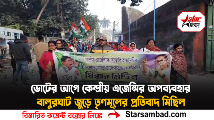 Home Uncategorized ভোটের আগে কেন্দ্রীয় এজেন্সির ‘অপব্যবহার’-এর অভিযোগ, বালুরঘাট জুড়ে তৃণমূলের প্রতিবাদ মিছিল