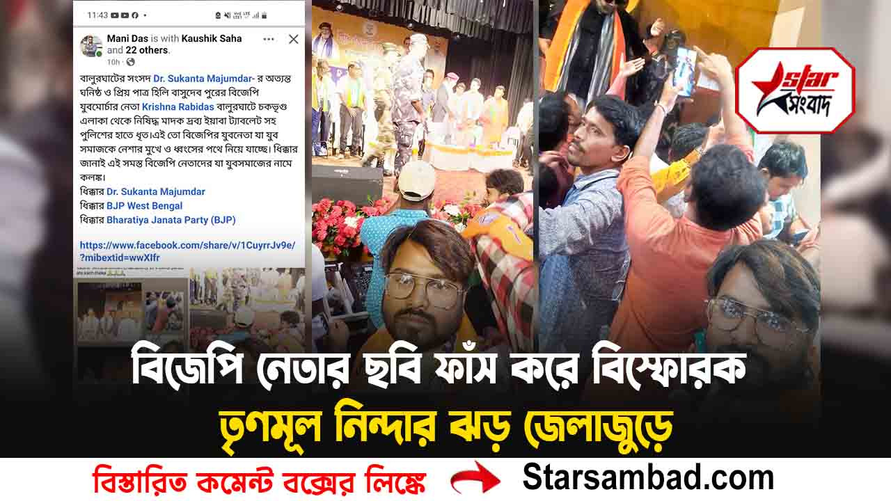 বুধবার দুপুরে এই ঘটনার বিস্ফোরণ ঘটান বালুরঘাট শহর যুব তৃণমূল কংগ্রেসের সভাপতি মনি দাস। তিনি ফেসবুকে পোস্ট করেন মিঠুন চক্রবর্তীর বৈঠকে কৃষ্ণ রবিদাসের উপস্থিতির একাধিক ছবি। মুহূর্তেই ঝড় ওঠে সোশ্যাল মিডিয়ায়। মনি দাসের অভিযোগ, এই হচ্ছে বিজেপির প্রকৃত চরিত্র। যাদের কাঁধে যুবমোর্চার দায়িত্ব, তারাই মাদক পাচারে জড়িয়ে যুবসমাজকে ধ্বংসের দিকে ঠেলে দিচ্ছে। যে পোস্টটি মুহূর্তে ভাইরাল হয়ে পড়ে জেলায়।
