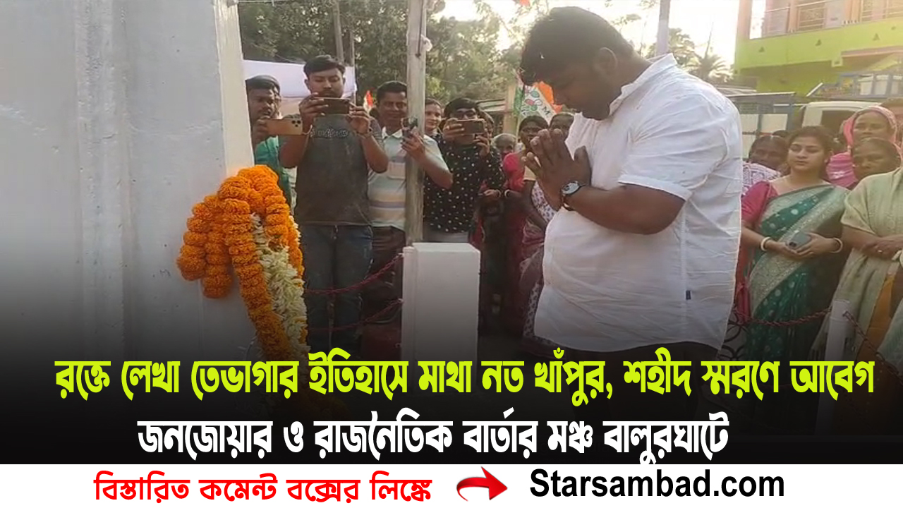 জেলা প্রশাসনের নির্ধারিত সূচি মেনে বিকেল তিনটায় কিষান ক্ষেতমজদুর তৃণমূল কংগ্রেসের উদ্যোগে তেভাগা আন্দোলনের শহীদ বেদীতে মাল্যদান করে শহীদদের প্রতি গভীর শ্রদ্ধা নিবেদন করা হয়। শহীদ বেদীর সামনে নীরবতা ও স্লোগানে মিশে যায় ইতিহাসের আবেগ। যেখানে উপস্থিত ছিলেন জেলা কিষাণ খেত মজদুর তৃণমূল কংগ্রেসের সভাপতি শাহেনশা মোল্লা, বালুরঘাট ব্লক সভাপতি বিপ্লব দেবনাথ, মহিলা তৃণমূল কংগ্রেস জেলা সভাপতি স্নেহলতা হেমব্রম, জেলা তৃণমূলের সাধারণ সম্পাদক অশোক মিত্র ও মফিজ উদ্দিন মিয়া, ব্লক সভাপতি মলয় মণ্ডল-সহ একাধিক নেতৃত্ব। আয়োজিত হয় বর্ণাঢ্য মিছিল, যেখানে বিভিন্ন শাখা সংগঠনের কর্মী-সমর্থকদের উপস্থিতিতে এলাকা মুখর হয়ে ওঠে স্লোগানে। শহীদ পরিবারগুলিকে সংবর্ধনা জানিয়ে তাঁদের আত্মত্যাগকে স্মরণ করা হয় বিশেষ সম্মানের সঙ্গে।