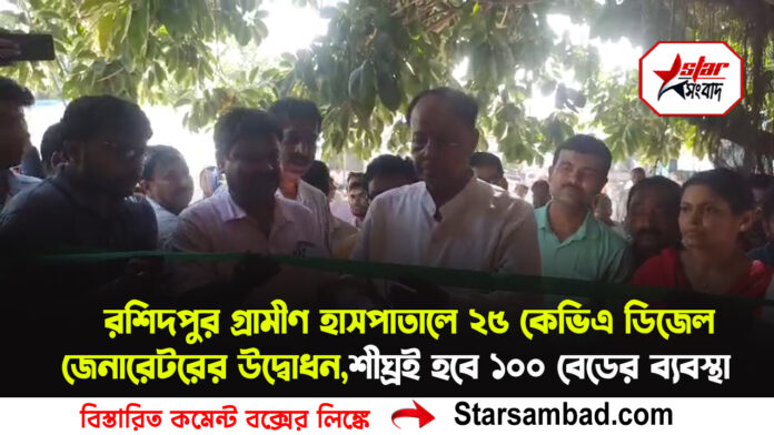 দীর্ঘদিনের অপেক্ষার অবসান।শনিবার রশিদপুর গ্রামীণ হাসপাতালে ২৫কেভিএ ক্ষমতাসম্পন্ন ডিজেল জেনারেটরের শুভ উদ্বোধন করলেন রাজ্যের ক্রেতা ও সুরক্ষা দপ্তরের মন্ত্রী এবং হরিরামপুরের বিধায়ক বিপ্লব মিত্র। পাশাপাশি, হাসপাতালটিকে শীঘ্রই ১০০ বেডে রূপান্তর করার আশ্বাস দিলেন তিনি ও জেলা মুখ্যস্বাস্থ্য আধিকারিক ডা. সুদীপ দাস।