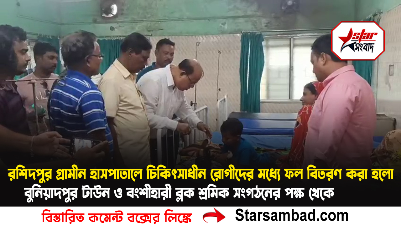 রশিদপুর গ্রামীন হাসপাতালে চিকিৎসাধীন রোগীদের মধ্যে ফল বিতরণ করা হলো বুনিয়াদপুর টাউন ও বংশীহারী ব্লক শ্রমিক সংগঠনের পক্ষ থেকে।