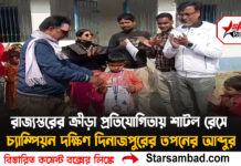 পিন্টু কুন্ডু , বালুরঘাট, ৬ জুন––– করোনার লকডাউনে অসহায় মানুষদের পাশে দাড়াতে এগিয়ে এলেন বালুরঘাট হাইস্কুলের প্রাক্তন ছাত্ররা । রবিবার বিদ্যালয় প্রাঙ্গনে সকলে একত্রিত হয়ে শতাধিক মানুষের মধ্যে খাবার সামগ্রী তুলে দেন । ২০০১ সালের মাধ্যমিক ব্যাচের ছাত্ররা এদিন এমনই একটি অভিনব উদ্যোগ নেন । ছাত্রদের দাবী, লকডাউনে কিছু অসহায় মানুষের পাশে দাঁড়াতেই তাদের এমন উদ্যোগ । আগামীতেও বালুরঘাটের বিভিন্ন এলাকায় অসহায় মানুষদের কাছে রেশন সামগ্রী পৌঁছে দেবেন তারা । এছাড়াও বিদ্যালয়ের তরফে লকডাউনের জন্য যে কিচেন চালানো হচ্ছে সেখানেও সাহায্য করবেন তারা বলেও জানানো হয়েছে ছাত্রদের তরফে।