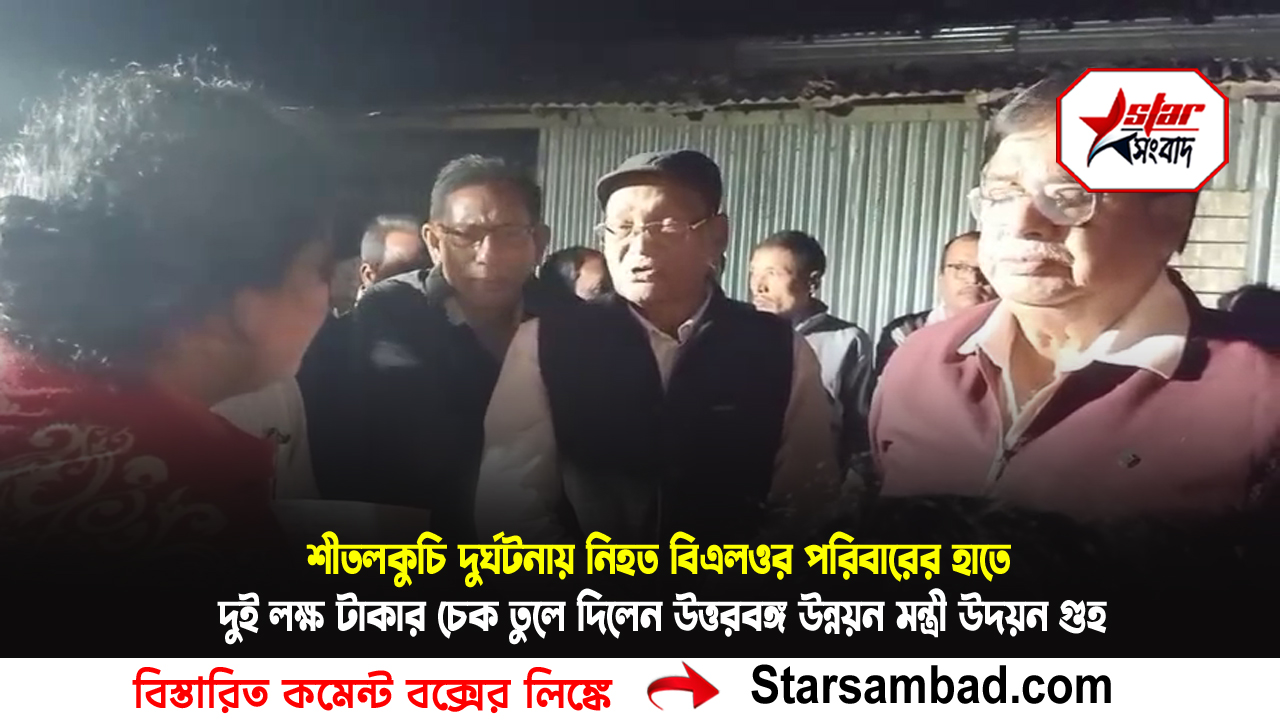 কোচবিহার:- শীতলকুচি দুর্ঘটনায় নিহত বিএলওর পরিবারের সাথে দেখা করে পরিবারের হাতে দুই লক্ষ টাকার চেক তুলে দিলেন উত্তরবঙ্গ উন্নয়ন মন্ত্রী উদয়ন গুহ। এদিন সন্ধায় শীতলকুচি ব্লকের গোসাইহাটের বড় ধাপের যাত্রা এলাকায় এসআই আরের কাজ সেরে মাথাভাঙ্গা ফেরার পথে শীতলকুচি মাথাভাঙ্গা সড়কের ধরলা সেতু সংলগ্ন এলাকায় গাড়ির ধাক্কায় জখম হন।উদ্ধার করে মাথাভাঙ্গা মহকুমা হাসপাতালে এবং পরে কোচবিহার বেসরকারি হাসপাতালে নিয়ে গেলে চিকিৎসকরা মৃত বলে জানায়।এদিন দুর্ঘটনায় নিহত বিএলও ললিত অধিকারীর পরিবারের সঙ্গে সাক্ষাৎ করেন এবং পরিবারের লোকদের পাশে থাকার বার্তা দেন উত্তরবঙ্গ উন্নয়ন মন্ত্রী উদয়ন গুহ। এদিন তিনি ললিত অধিকারীর স্ত্রীর হাতে দুই লক্ষ টাকার চেক তুলে দেন এবং ললিত অধিকারীর স্ত্রী তার বড় ছেলের চাকরির দাবি করেন মন্ত্রীর কাছে। মন্ত্রী বিষয়টি দেখবেন বলে আশ্বাস দিয়েছেন
