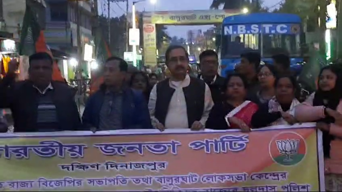 বালুরঘাট, ১৩ ফেব্রুয়ারী —— সন্দেশখালিতে বিজেপির রাজ্য সভাপতি সুকান্ত মজুমদার ও দলীয় কর্মীদের উপর পুলিশি নির্যাতন ও লাঠি চার্জের প্রতিবাদে রাস্তায় নামলো বিজেপি। বালুরঘাটে টায়ার জ্বালিয়ে পথ অবরোধ করে বিক্ষোভ বিজেপির নেতাকর্মীদের। মঙ্গলবার শহরের হিলি মোরে এই ঘটনাকে ঘিরে তুমুল উত্তেজনা ছড়ায় এলাকায়। পথ অবরোধের জেরে আটকে পড়ে বালুরঘাট হিলি ও বালুরঘাট মালদা রুটের সমস্ত যানবাহন। তৈরি হয় দীর্ঘ যানজটেরও। এদিন যে আন্দোলনের পুরোভাগে থেকে নেতৃত্ব দিতে দেখা যায় বিধায়ক অশোক লাহিড়ী ও বিজেপি নেতা বাপী সরকারকে। যদিও পরবর্তীতে পুলিশি হস্তক্ষেপে স্বাভাবিক হয়েছে পরিস্থিতি।