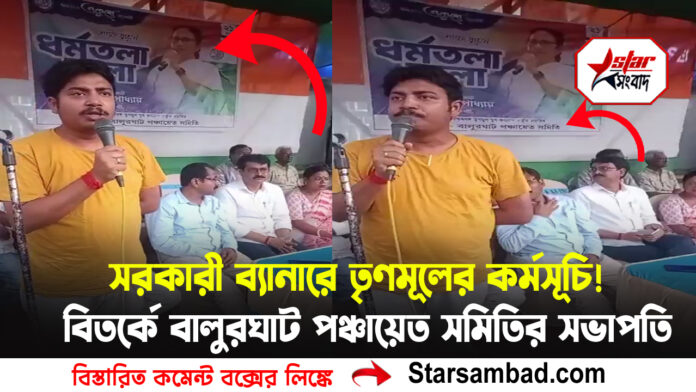 বালুরঘাট, ১৩ জুলাই ——-সরকারি ব্যানারে তৃণমূলের দলীয় প্রচার করে বিতর্কে জড়ালেন বালুরঘাট পঞ্চায়েত সমিতির সভাপতি। যে ছবি প্রকাশ্যে আসতেই রাজনীতির পারদ চড়ল দক্ষিণ দিনাজপুরে। শনিবার পতিরামের চৌরঙ্গীতে তৃণমূল কংগ্রেসের ২১ জুলাই ধর্মতলা চলো কর্মসূচির প্রস্তুতি সভায় মঞ্চের একাংশে লাগানো ব্যানার ঘিরে শুরু হয়েছে বিস্তর বিতর্ক। কারণ, ব্যানার জুড়ে মুখ্যমন্ত্রী মমতা বন্দ্যোপাধ্যায়ের ছবি, নীচে স্পষ্ট লেখা — ‘প্রচারে বালুরঘাট পঞ্চায়েত সমিতি’। সরকারি পঞ্চায়েত সমিতির নামেই দলীয় কর্মসূচি! সেই ভিডিও ছড়িয়ে পড়তেই বিতর্কের কাঠগড়ায় দাঁড়িয়েছেন বালুরঘাট পঞ্চায়েত সমিতির সভাপতি অরূপ সরকার।