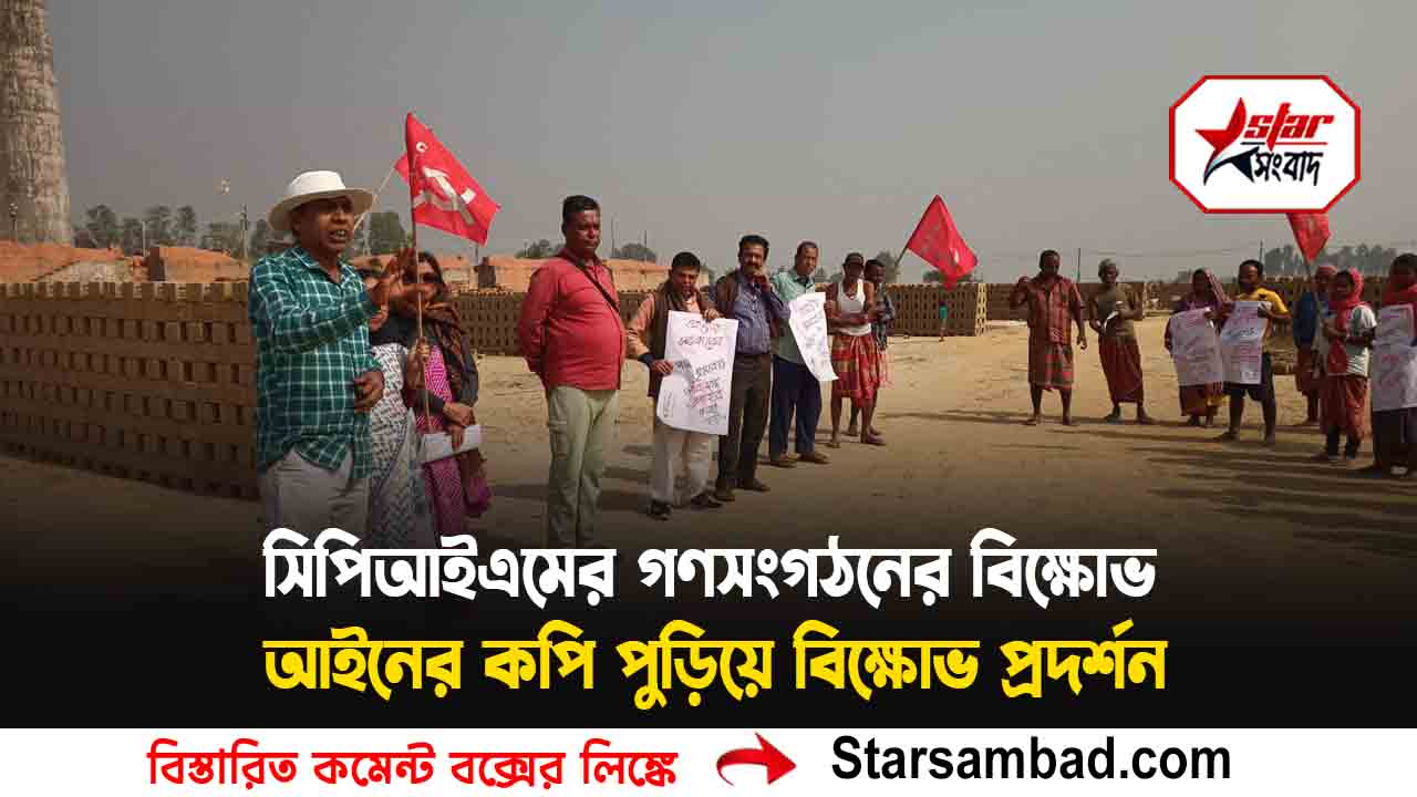 শীতল চক্রবর্তী গঙ্গারামপুর ২৫ নভেম্বর :-কেন্দ্রীয় সরকারের আনা শ্রমিক স্বার্থ বিরোধী শ্রমকোড প্রত্যাহারের দাবিতে CITU(সিটু), সারাভারত কৃষকসভা, সারাভারত ক্ষেত মজুর ও গ্রামীণ শ্রমজীবি ইউনিয়নের পক্ষ থেকে মঙ্গলবার গঙ্গারামপুর ব্লকের ঠ্যাঙ্গাপাড়া জালালপুর মুক্তা ইট ভাটায় এই আইনের কপি পুড়িয়ে বিক্ষোভ প্রদর্শন করা হয়।সঙ্গে এবিষয়ে বক্তব্য রাখেন উপস্থিত নেতৃত্বরা । উপস্থিত ছিলেন শ্রমিক নেতা অনুপ দেব, উমা পন্ডিত, কৃষক নেতা মনীন্দ্র নাথ সরকার, ক্ষেতমজুর ইউনিয়নের জেলা সম্পাদক সুবীর কুমার দাস,গণ আন্দোলনের নেতা সুশান্ত বিশ্বাস, অনিমা ঘোষ,অসিত সরকার সহ অন্যান্য নেতৃত্ব ।