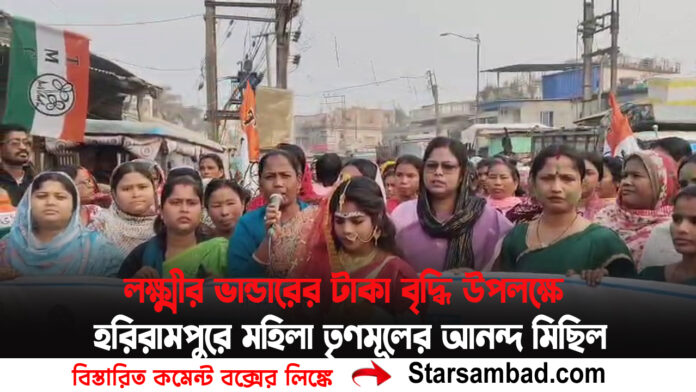 রাজ্যজুড়ে লক্ষ্মীর ভান্ডার প্রকল্পে মাসিক আর্থিক সহায়তা ৫০০ টাকা বৃদ্ধি পাওয়ায় উচ্ছ্বাসে মেতে উঠলেন তৃণমূল কংগ্রেসের মহিলা কর্মীরা। এই আনন্দে সোমবার দুপুরে দক্ষিণ দিনাজপুর জেলার হরিরামপুর জুড়ে একটি বর্ণাঢ্য আনন্দ মিছিলের আয়োজন করা হয়।