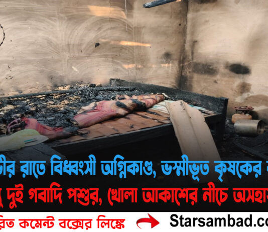 গভীর রাতে বিধ্বংসী অগ্নিকাণ্ড, ভস্মীভূত কৃষকের বাড়ি—পুড়ে মৃত্যু দুই গবাদি পশুর, খোলা আকাশের নীচে অসহায় পরিবার